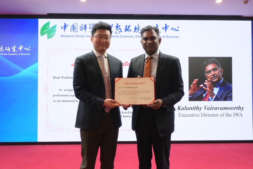 Kalanithy Vairavamoothy自2017年起担任IWA执行主席,长期推动该协会在智能化水处理解决方案、气候变化适应和卫生设施改善等领域的多项全球倡议,促进了国际水管理合作与政策发展。IWA与中国科学院生态环境研究中心始终保持密切的学术交流与合作。为表彰Kalanithy Vairavamoothy在水科学与环境领域的卓越贡献,胡承志代表中心向其颁授荣誉教授聘书。