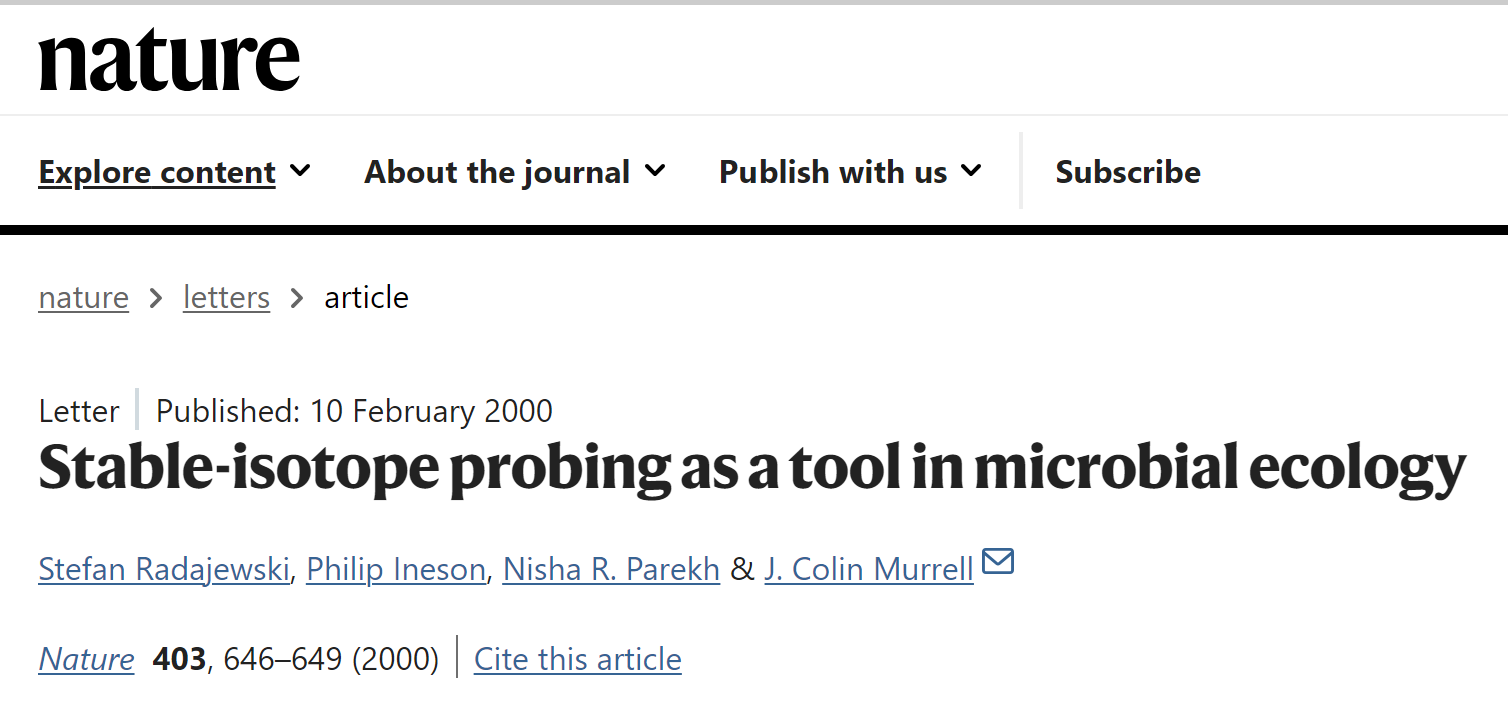 DNA-SIP技术的发明:由J. Colin Murrell率先提出,将稳定性同位素示踪和分子生物学方法相结合,能够在复杂的环境中分析微米尺度下微生物的生理特性,以此获取参与土壤物质转化的功能微生物信息 (Radajewski et al., 2000)。该文被引1068次(Web of Science)