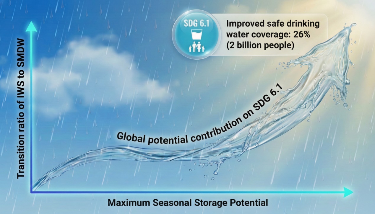 目前全球仍有22亿人缺乏安全饮用水服务,团队通过分析揭示了一个关键悖论:88.5%缺乏安全饮用水的人口生活在降雨量丰富地区,但仅有约1.26%的人直接将雨水作为饮用水源,表明雨水收集具有巨大的潜力。为准确量化这一潜力,团队构建了全球雨水收集潜力和SDG 6贡献潜力的双框架评估模型,精准量化了雨水收集潜力与安全饮用水覆盖率之间的关系。研究提出了可分步实施的双路径协同推进线路图:通过逐步延长季节性储存能力和逐步提高安全饮用水转换率,可将全球安全饮用水覆盖率提升5.6%至26.0%,使4.5亿至20.8亿人受益。研究进一步表明,雨水收集在更为贫穷、落后的国家可以产生更大的贡献潜力;全面推广雨水收集不仅能改善饮用水安全,还可与粮食安全(SDG 2)、公共卫生(SDG 3)、性别平等(SDG 5)和气候行动(SDG 13)等多个可持续发展目标形成积极的协同效应。