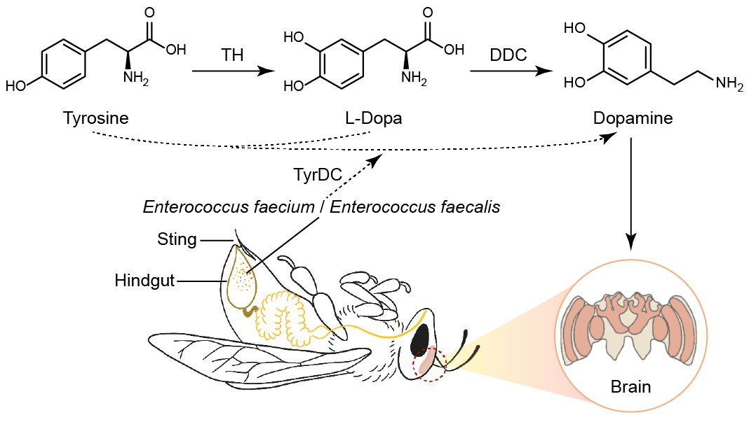 图2. 肠道菌群通过多巴胺代谢调控蜜蜂的习得性防御行为