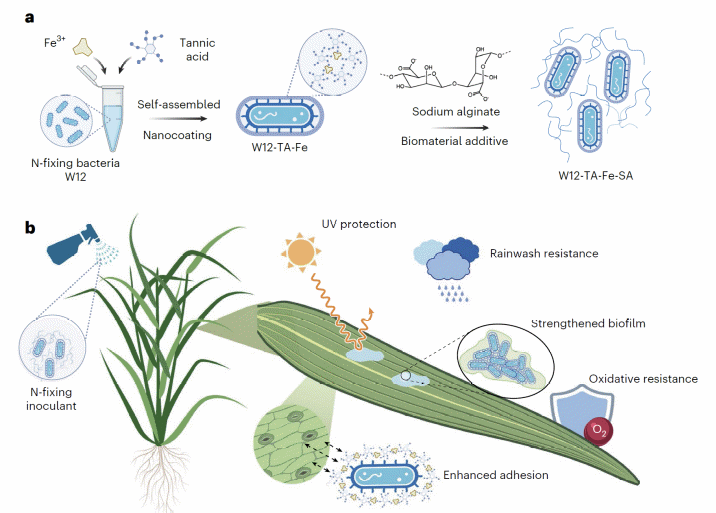 现代农业高度依赖化学氮肥来维持产量,但过度施肥已导致土壤退化、水体富营养化及温室气体排放等严重的环境问题。利用微生物进行生物固氮(将空气中的惰性的氮气转化为植物可吸收的活性养分)被视为一种绿色的替代方案。然而,传统的微生物菌剂在叶面施用时面临巨大挑战:叶片表面强烈的紫外线辐射、高温以及干燥缺水环境,往往导致细菌在发挥作用前就大量死亡。该研究在一定程度上缓解了氮肥过量使用带来环境危害。