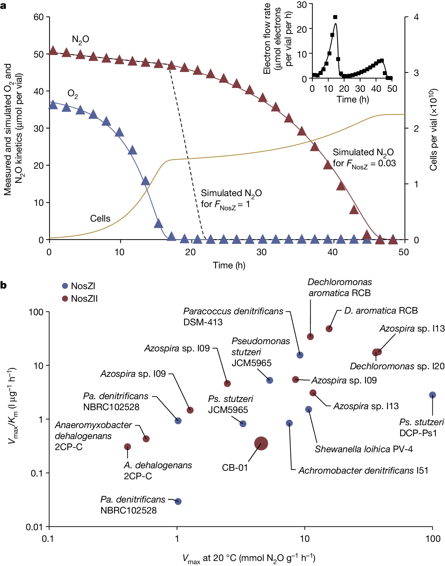 1| CB-01与其他N2O呼吸菌的动力学比较。CB-01在低N2O浓度下的催化效率较低,但具有较高的最大还原速率(Vmax