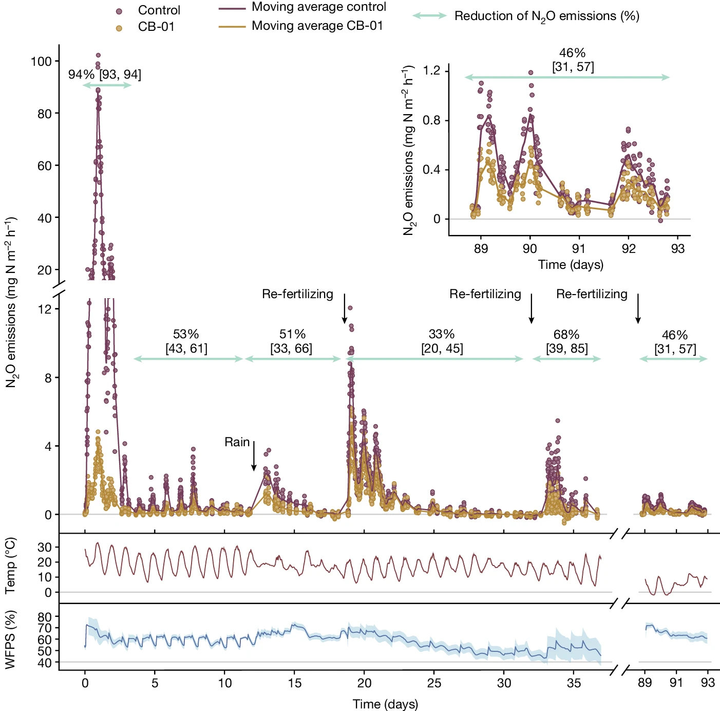 2 | CB-01pH 6.7黏壤土中对N2O排放的抑制效果。长期桶栽试验表明,CB-01能持续减少N2O排放,在施肥初期和后续的降雨、追肥事件中均表现出显著的减排效应。