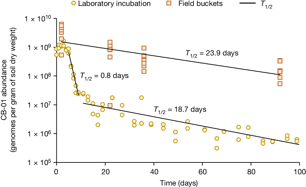 3 | CB-01在土壤中的存活动态。田间桶栽试验中,CB-01丰度在90天内维持在较高水平;而实验室恒温恒湿条件下,其丰度下降更快,突显了实际田间条件的复杂性。