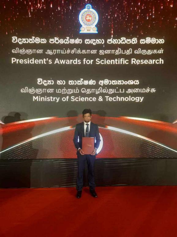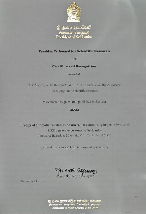 2025年12月18日,中心毕业生Joseph Titus Cooray博士和魏源送课题组的斯方合作伙伴Sujithra K. Weragoda博士, K.B.S.N Jinadasa教授和Rohan Weerasooriya教授荣获2025年斯里兰卡总统科学研究奖。